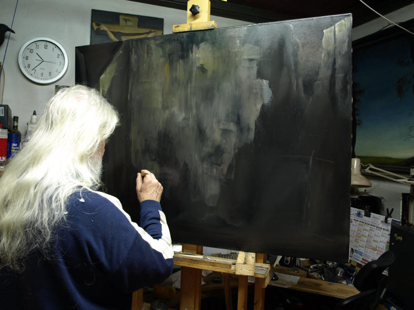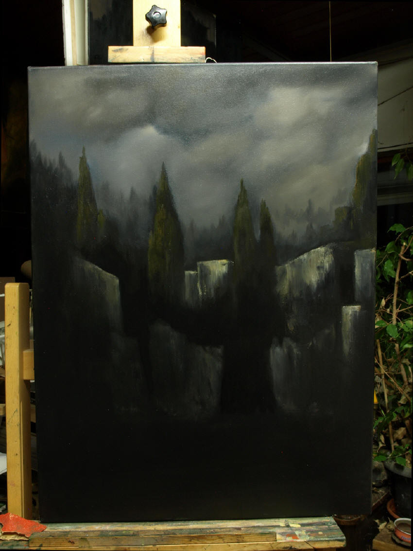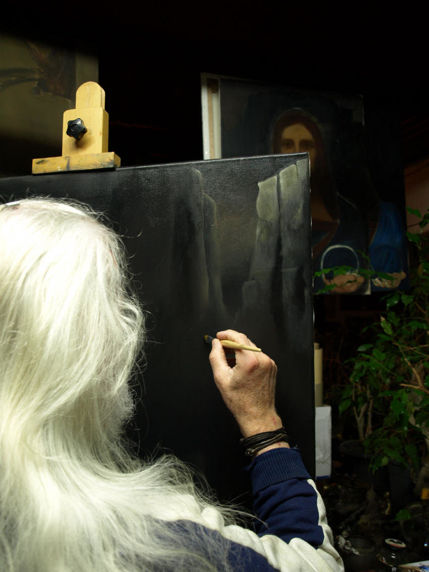 | Impression aus dem Atelier - Bearbeitung eines Toteninsel-Motivs | Salvator Mundi II (Öl auf Leinwand, noch unvollendet) | |