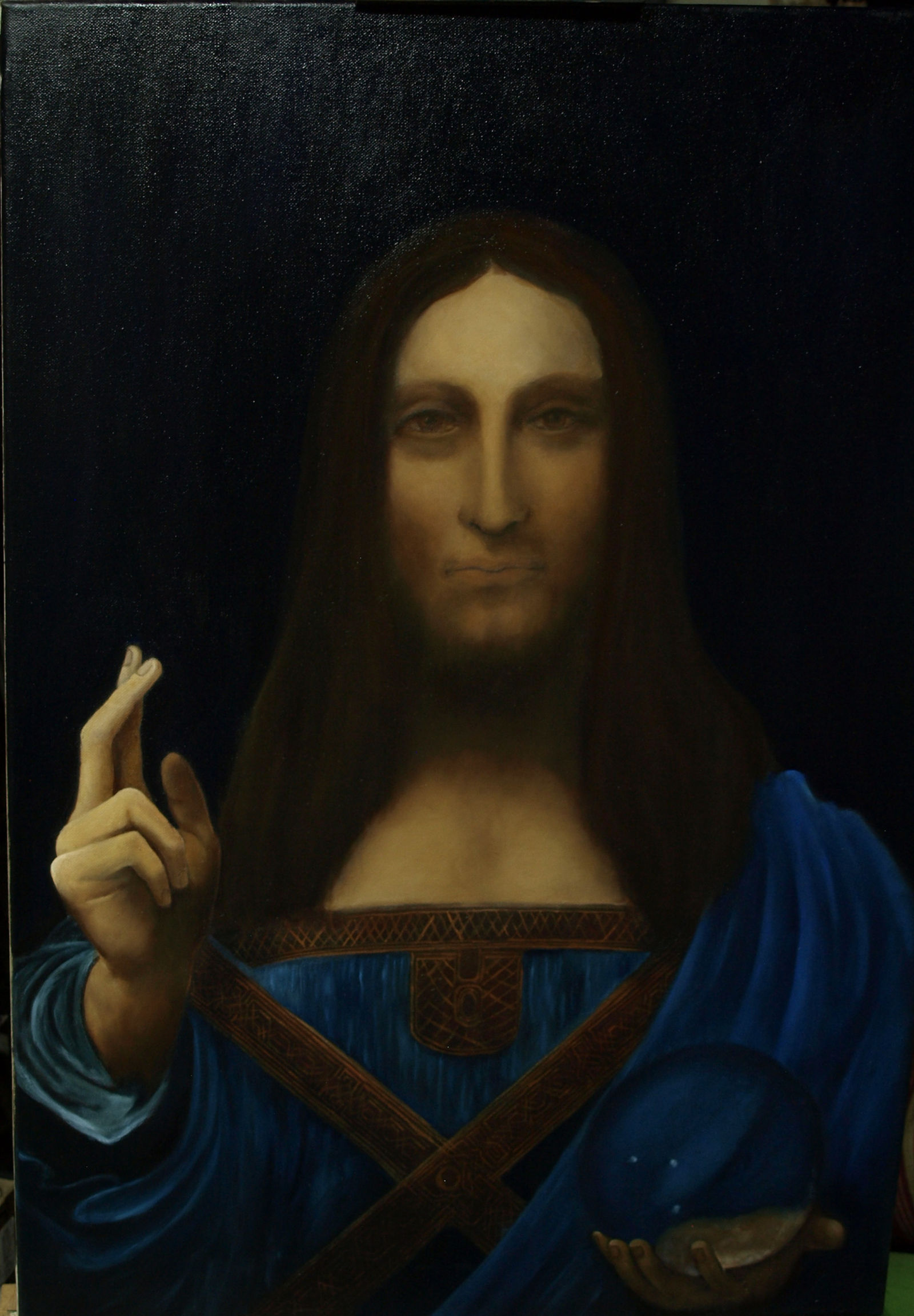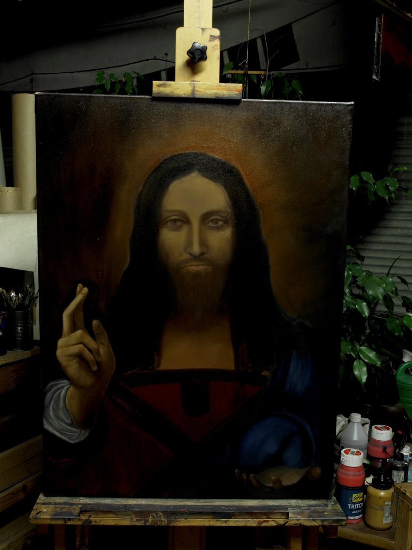 | Salvator Mundi - Kopie eines Gemäldes von Leonardo da Vinci (Öl auf Leinwand, noch unvollendet) | ||